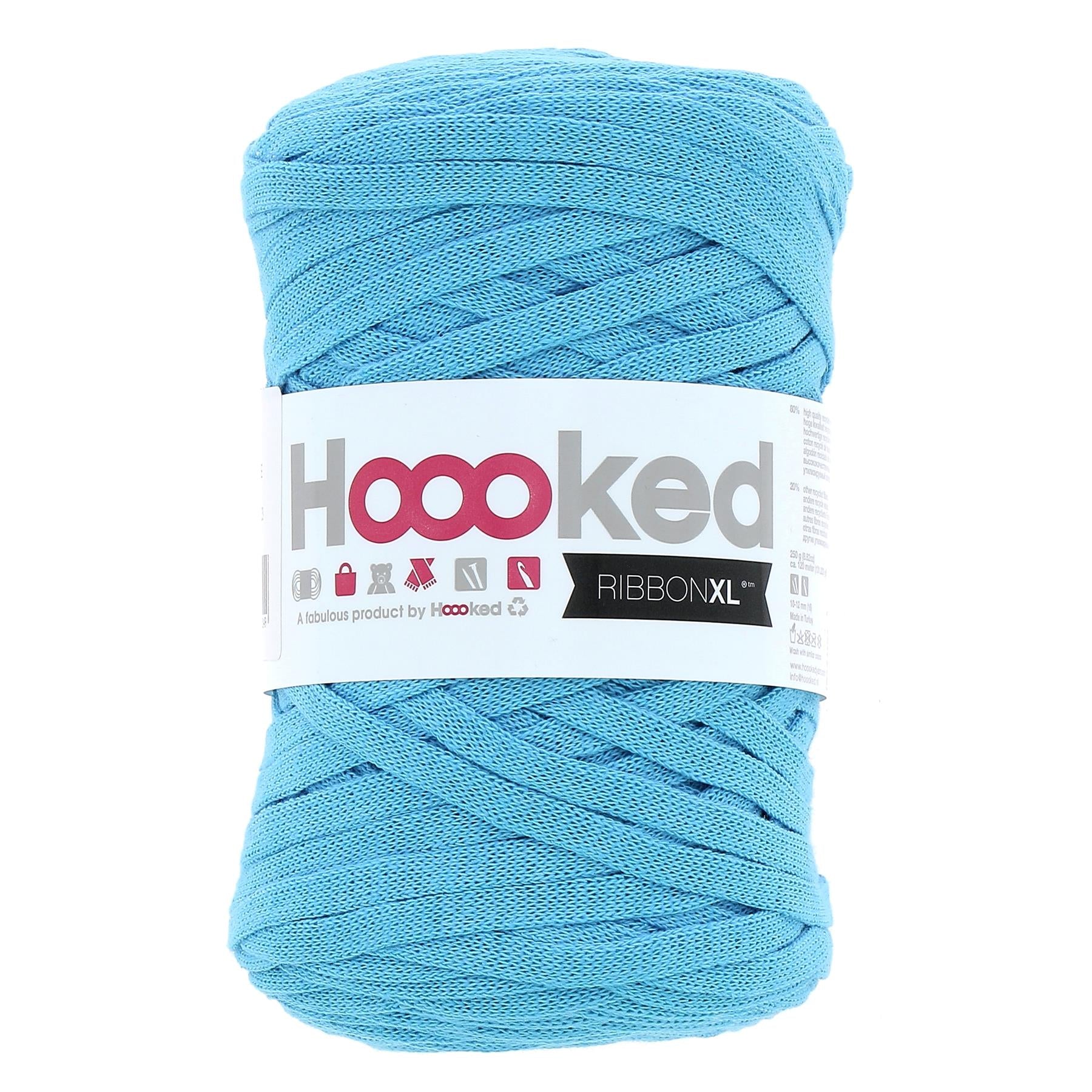 RibbonXL is our superb bulky and lightweight recycled fabric yarn that comes in standard series of our own fabulous Hoooked colours. RibbonXL fabric yarn is Hoooked Zpagetti's light weight sister. RibbonXL works easy, giving quick and stylish results. RibbonXL is an itch-free fabric yarn, it is slightly elastic and it knits very easy, giving you quick and stylish results. RibbonXL is made of 100% recycle fibres (of which 80% cotton) and is ideal to make your own extra-large amigurumi, home knits, and accessories and fashion garments. Each bobbin RibbonXL weighs approx. 250 grams and has 120 meters length. You can knit or crochet a surface of 40 x 40 cm. We recommend to use a crochet hook or knitting needles 8-12 mm, depending on your preferences. RibbonXL is machine washable and suitable for everyday use.